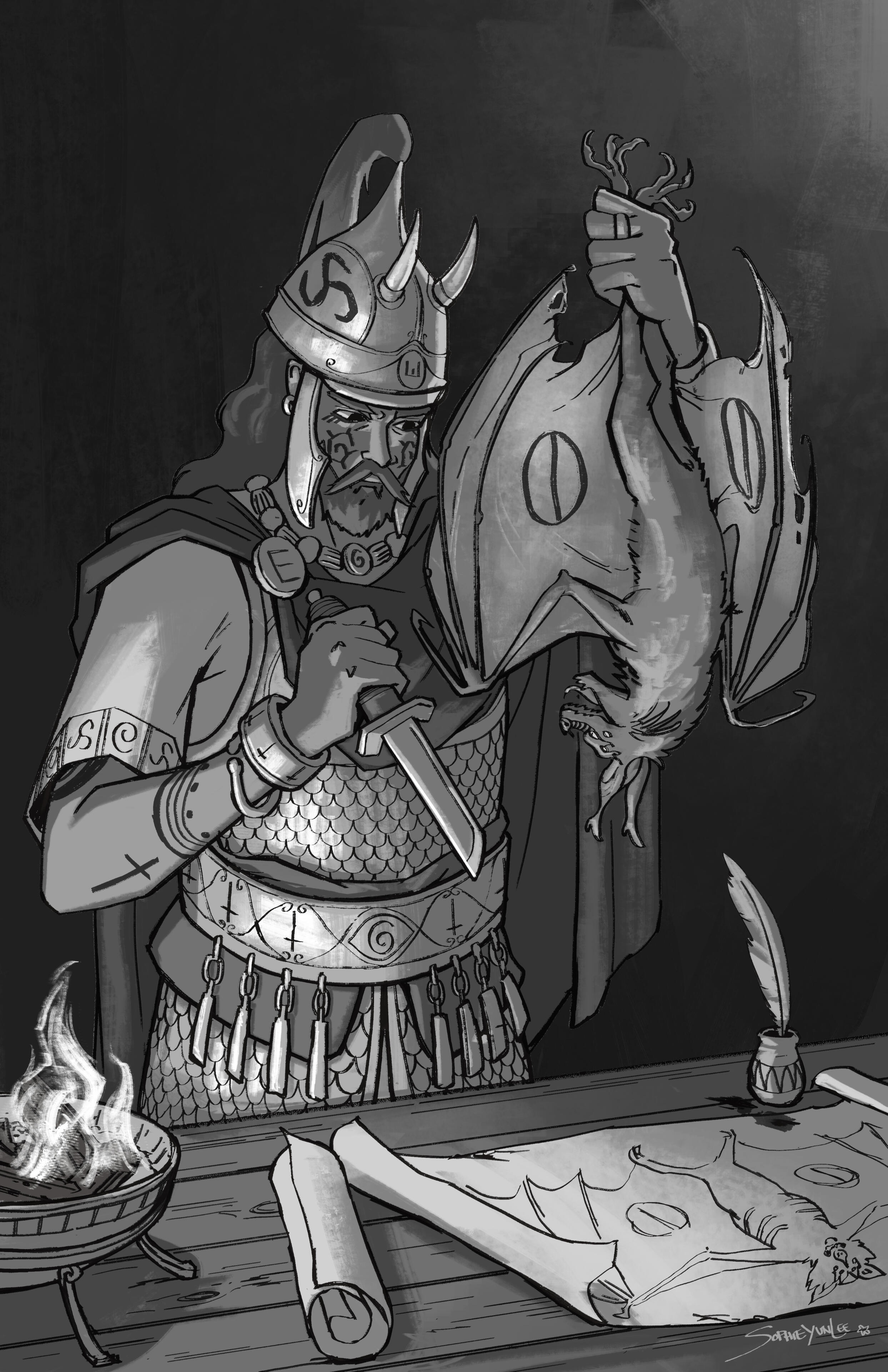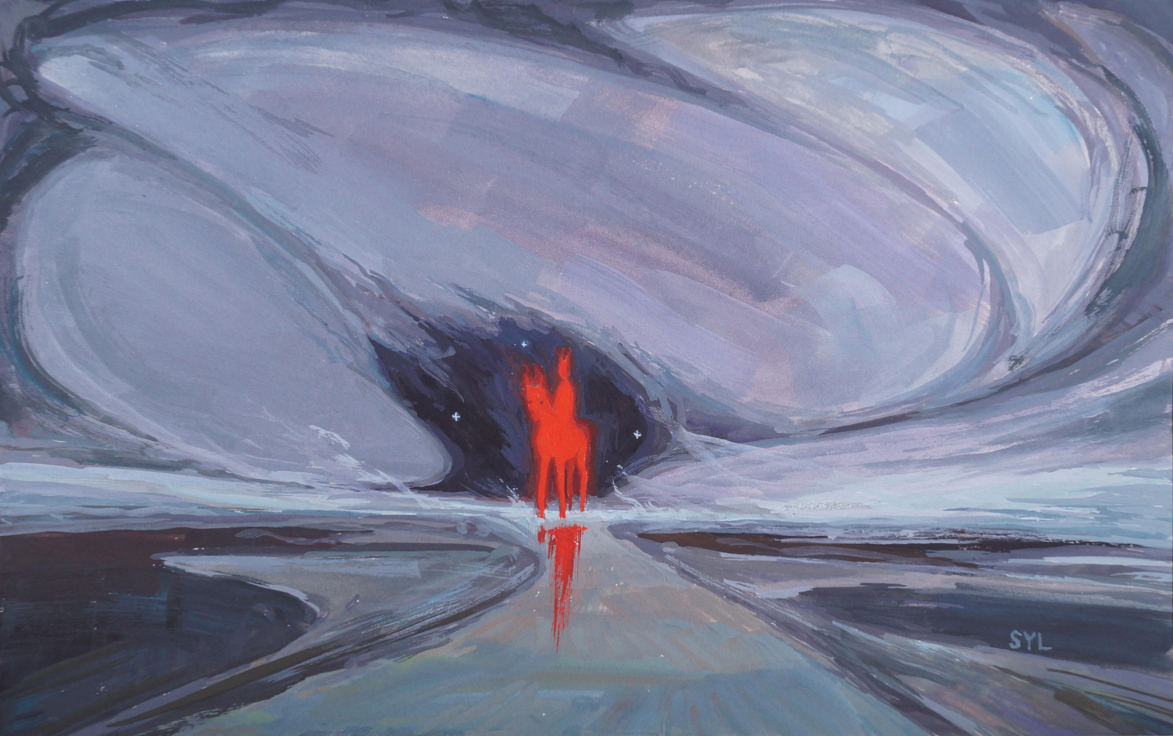 Below is a wordless short comic I created that tells the story of the events before the 3 larger paintings. The third sketch is a mood and lighting test.