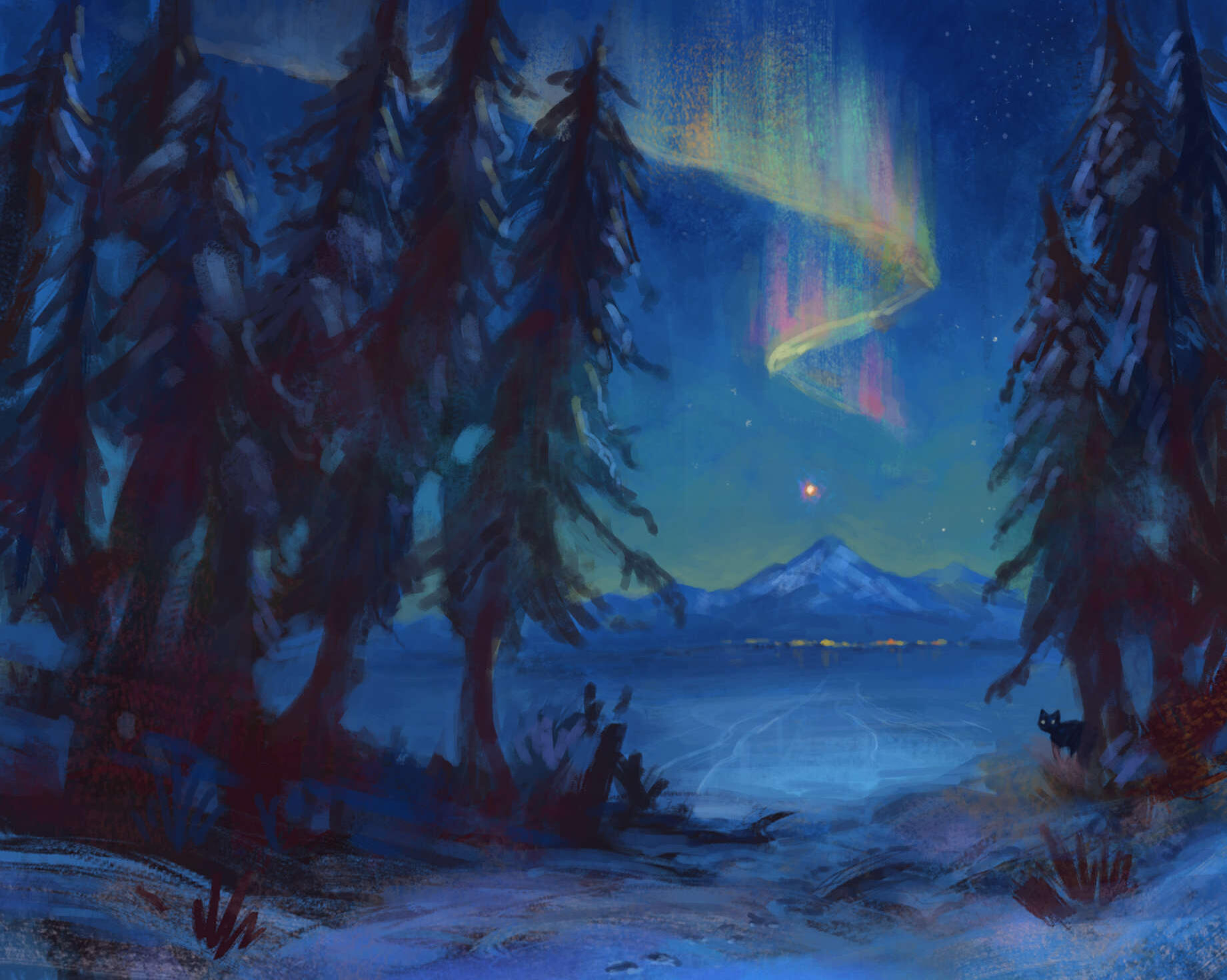 Esska & The Raven is a personal design project where I wanted to reflect on my experiences living in a northern climate and being surrounded by Alaskan culture. The work developed in this case took about 7 weeks. Half of that time focused on the designs, compositions, color, and light. The other half was painting and rendering the main keyframes.